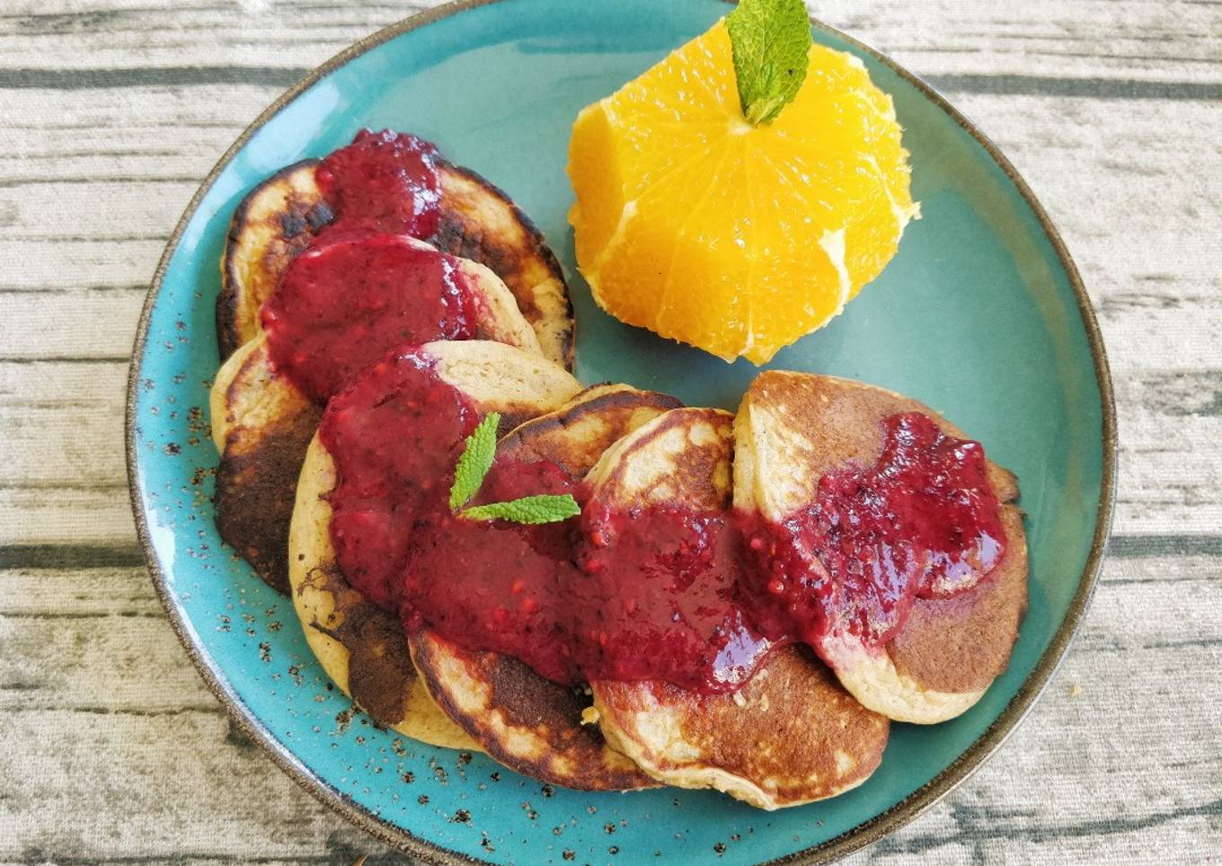 Tortitas de avena y plátano con sirope casero de frutos rojos