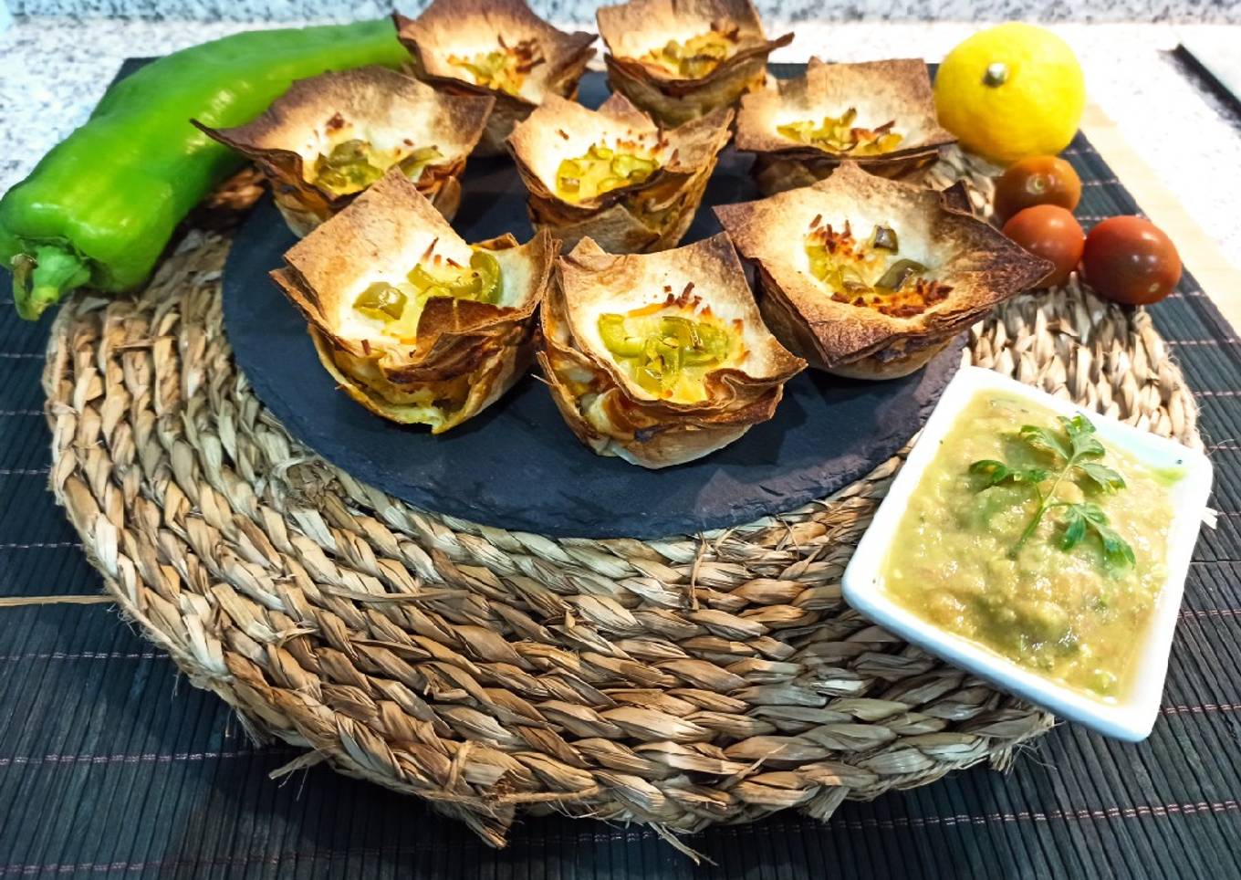 - Pre-calentamos el horno a 180° y comenzamos a elaborar el guacamole. Aplastamos el aguacate con aydua de un tenedor hasta obtener una pasta cremosa, rallamos el tomate y la cebolla y lo integramos junto con el aguacate. Rellenamos las bases que tenemos en el molde con poca cantidad, haremos varias capas y si ponemos mucha mezcla se nos desbordará.