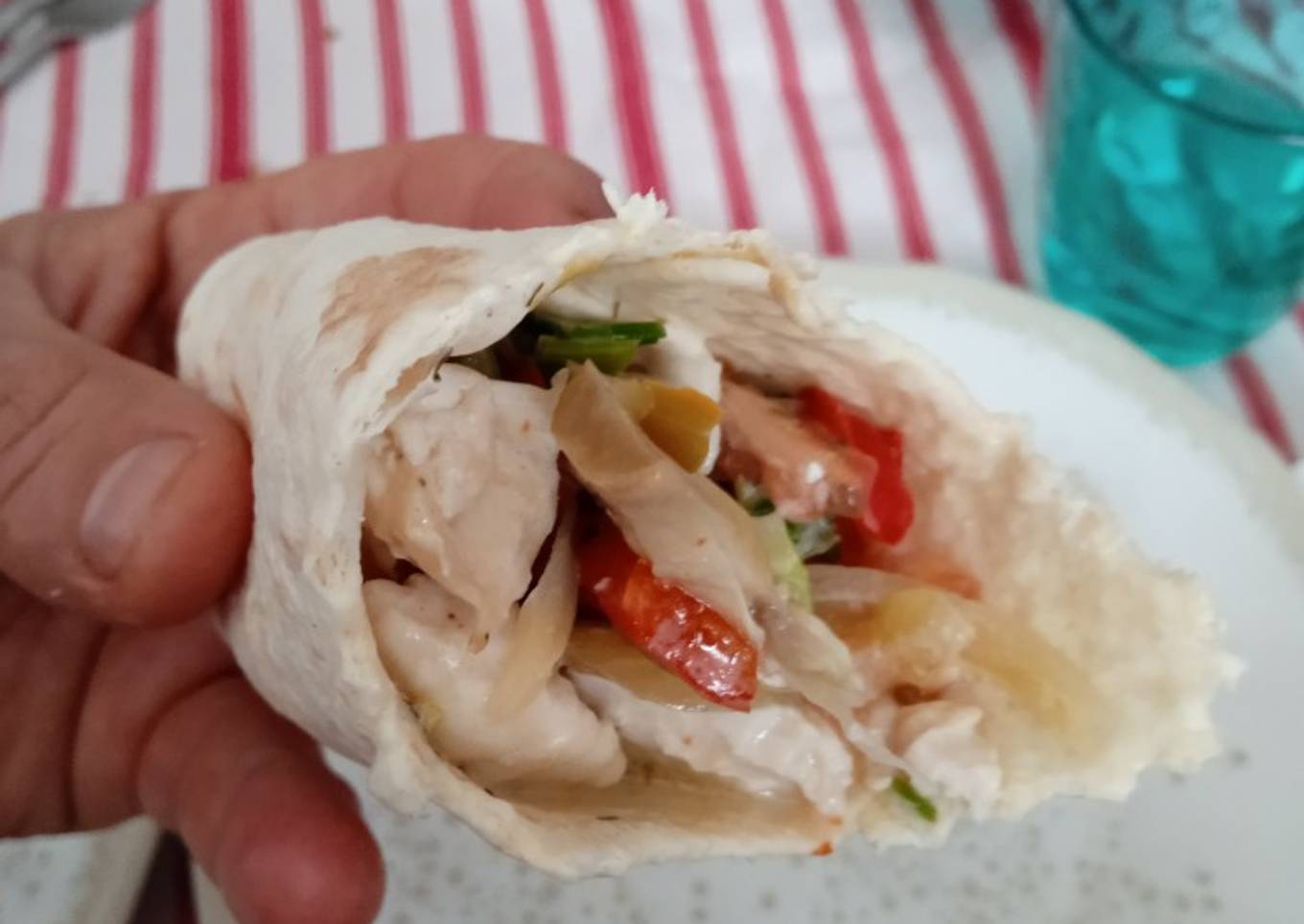 - Calentamos las fajitas en una sartén o en el microondas y, sobre ellas, colocamos el pollo(si lo desmenuzamos queda mejor), el bacon, las verduras y la salsa