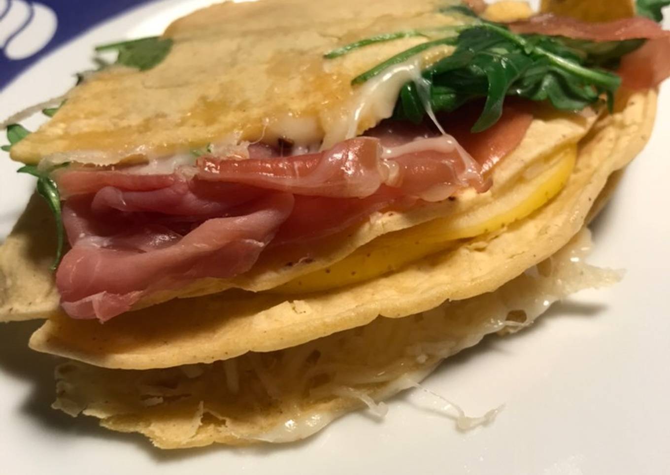 - Dobla ese cuarto y coloca el queso; dobla la tortita y pon el jamón; dobla y pon la rúcula. En una sartén calienta por ambos lados y listo! A disfrutarla! Está deliciosa... BON PROFIT!!